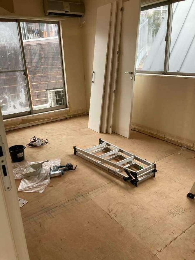今回は、はしごと脚立で足場を組みました。 安全に作業中です。 吹き抜け施工もお任せくださ...