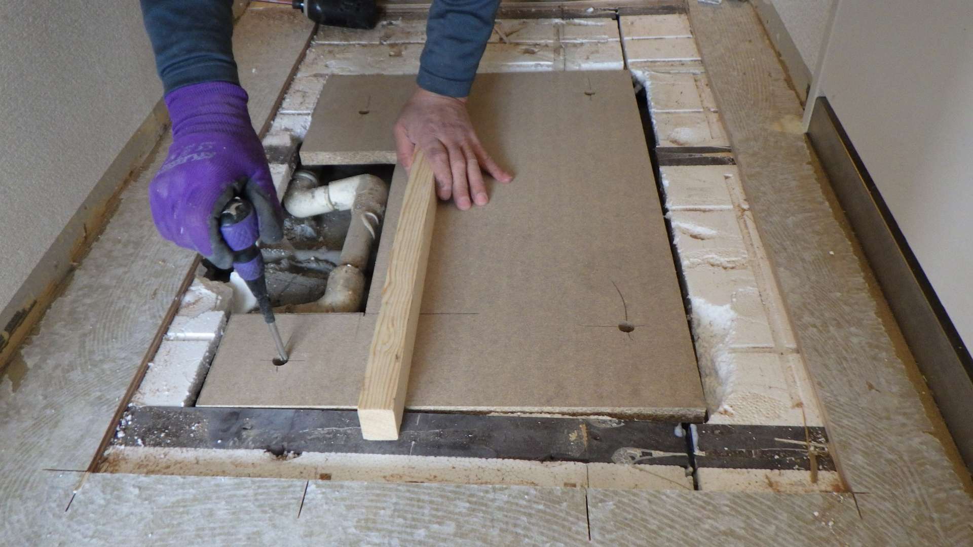 通路の根太なり・沈み込みの床補修工事です、早速床開けていきます