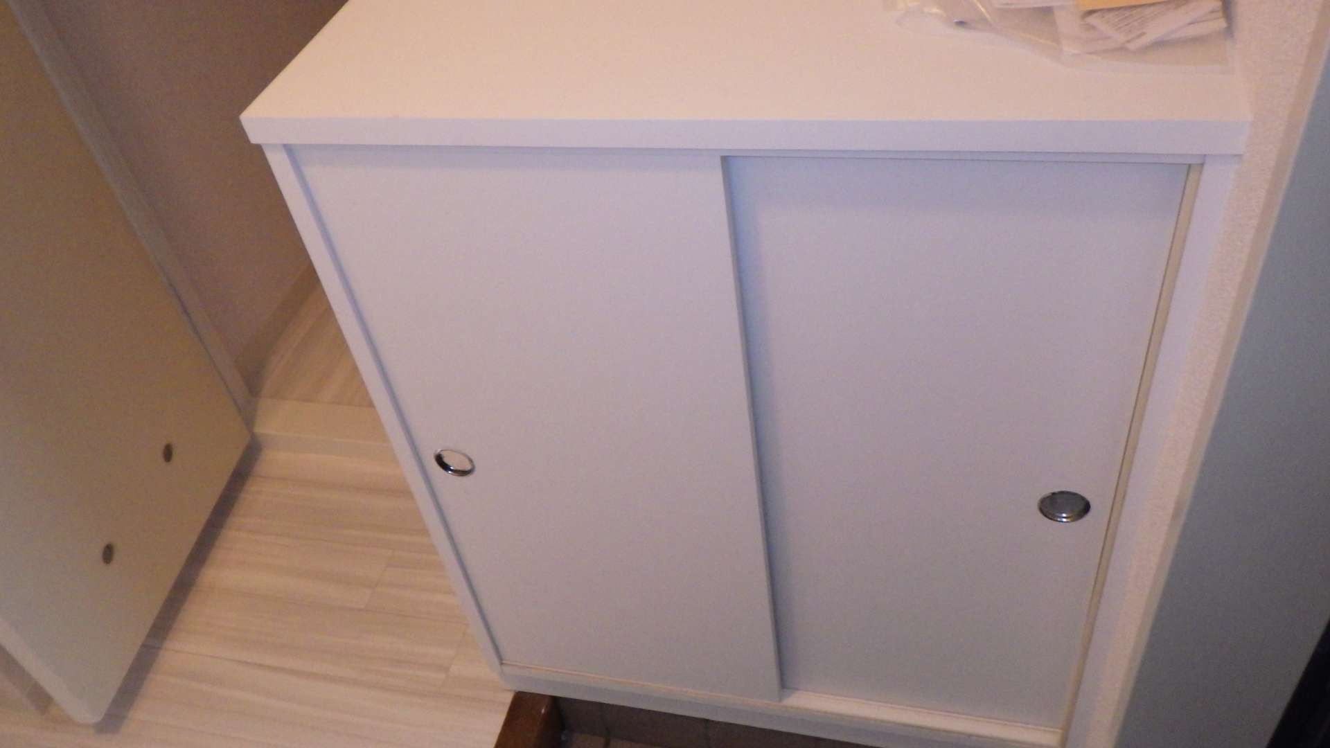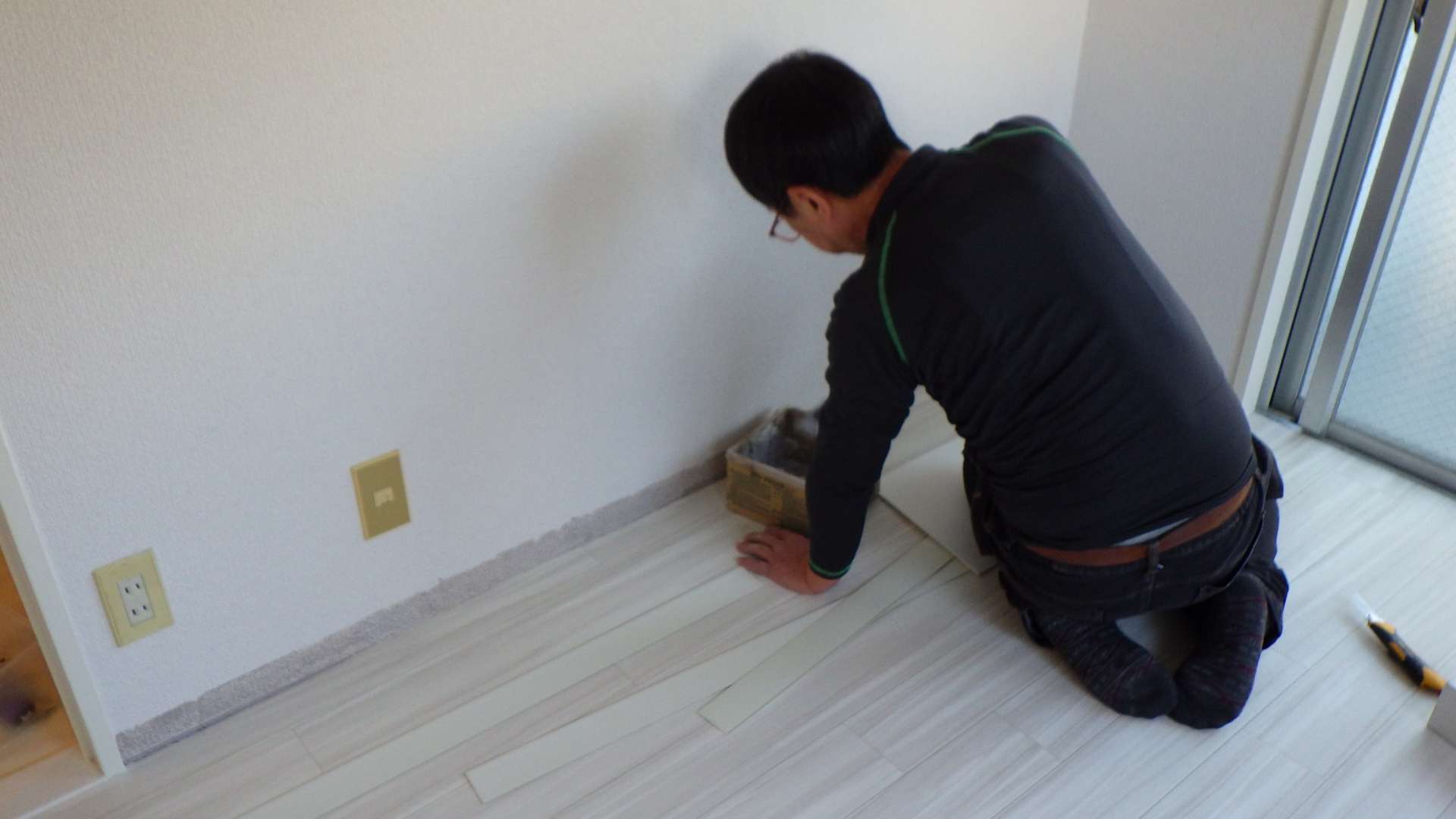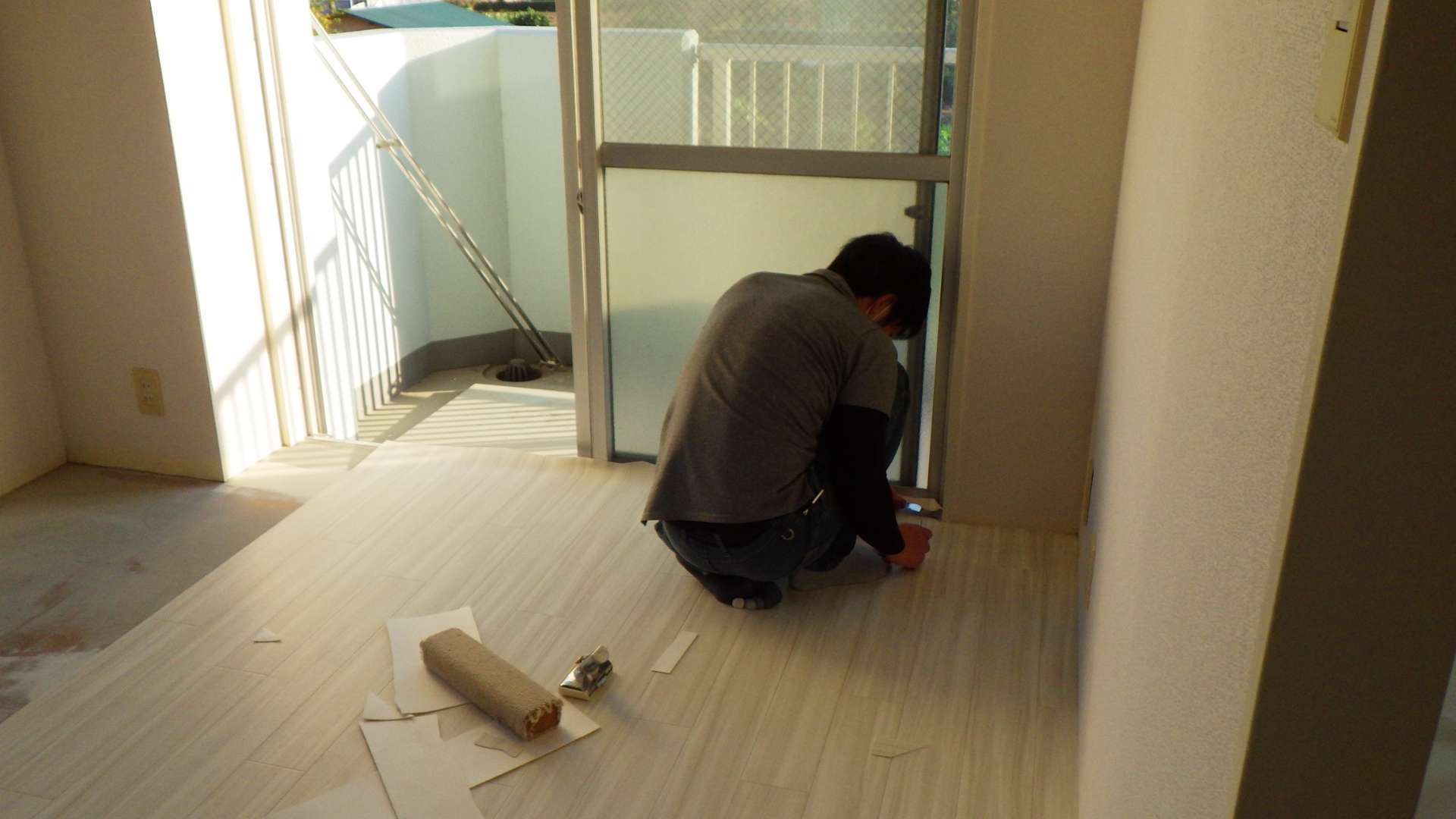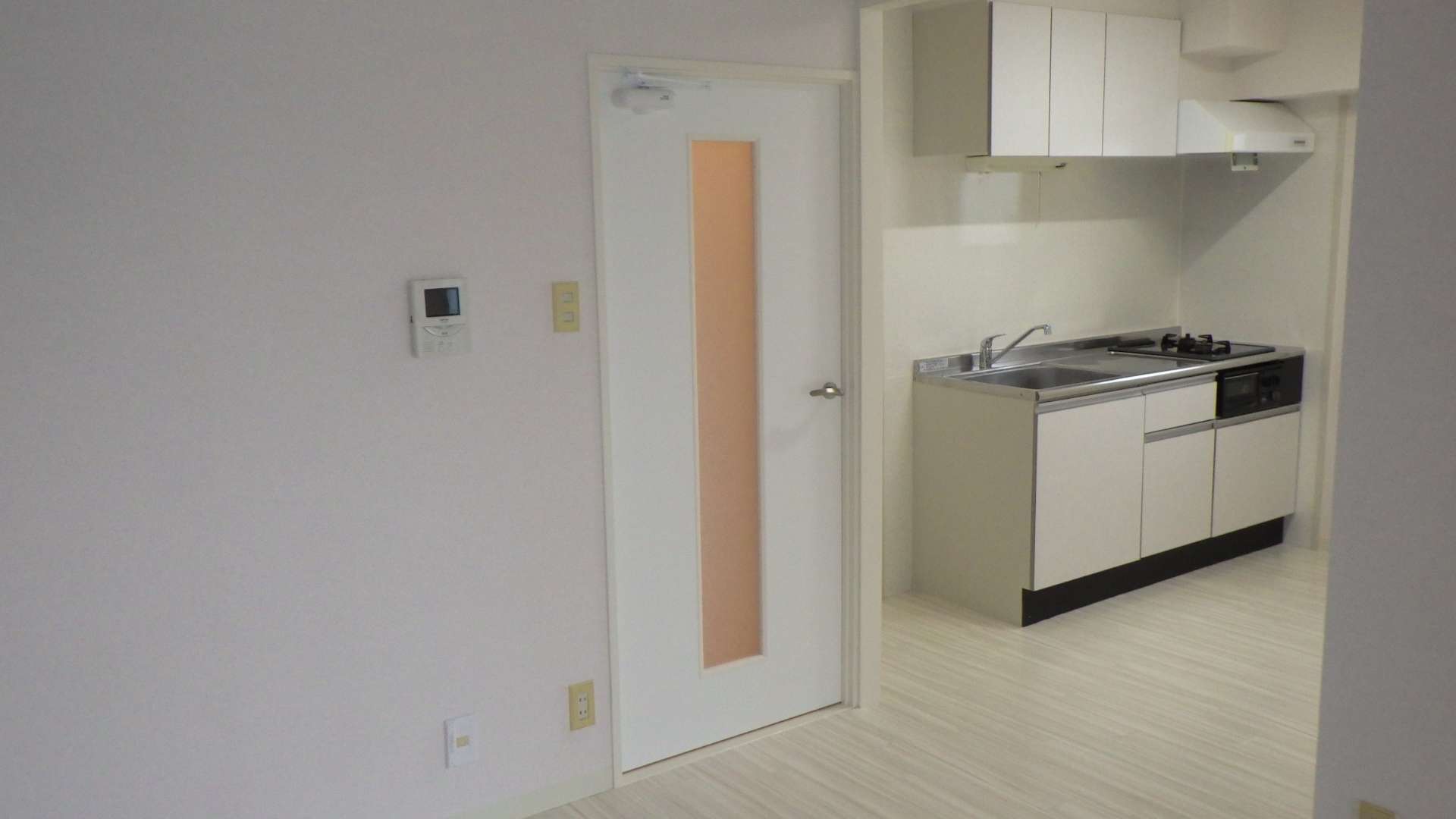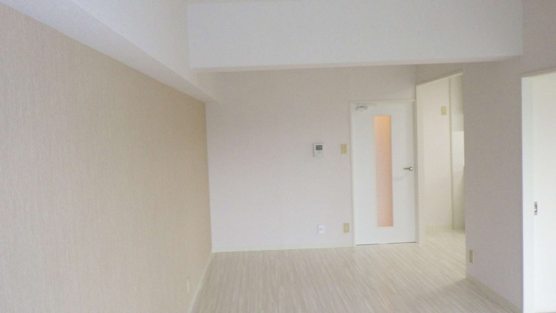 リビングはアクセントクロスで仕上げ,ドアはガラス入りに交換しています