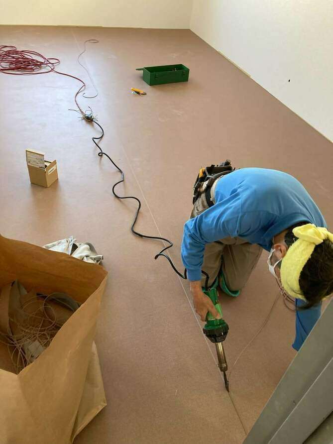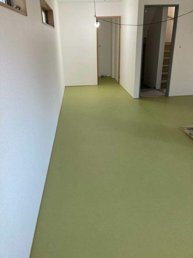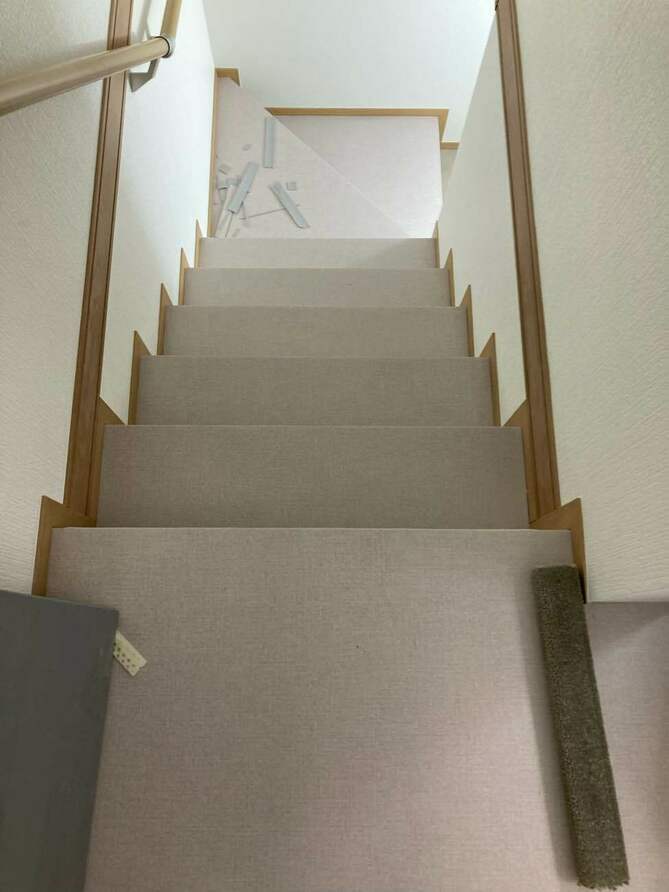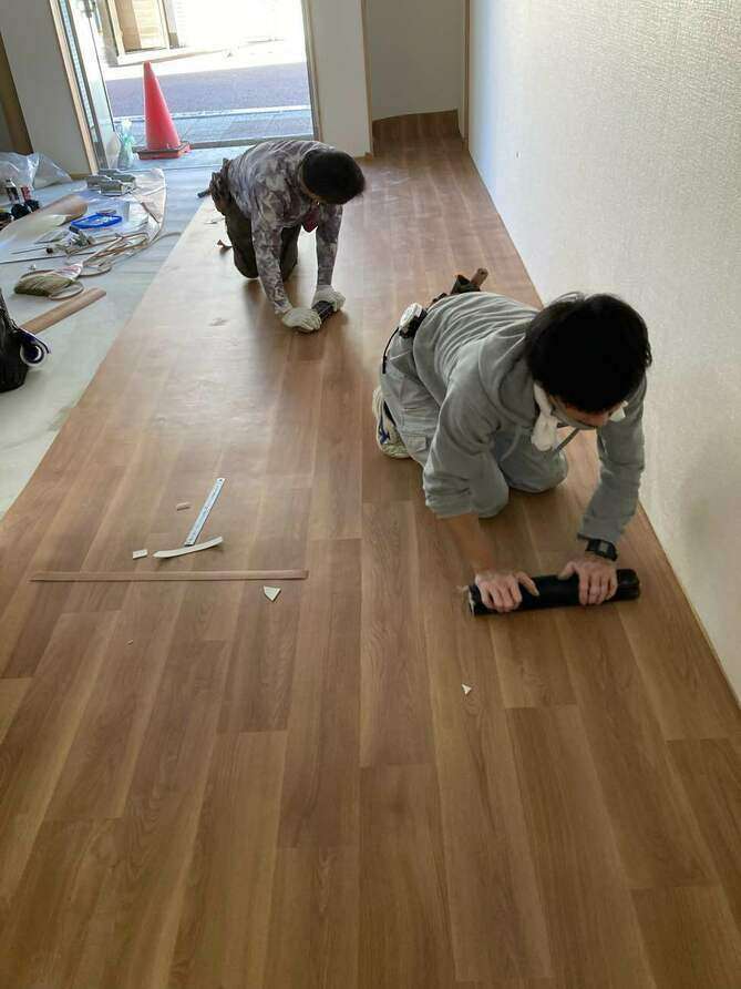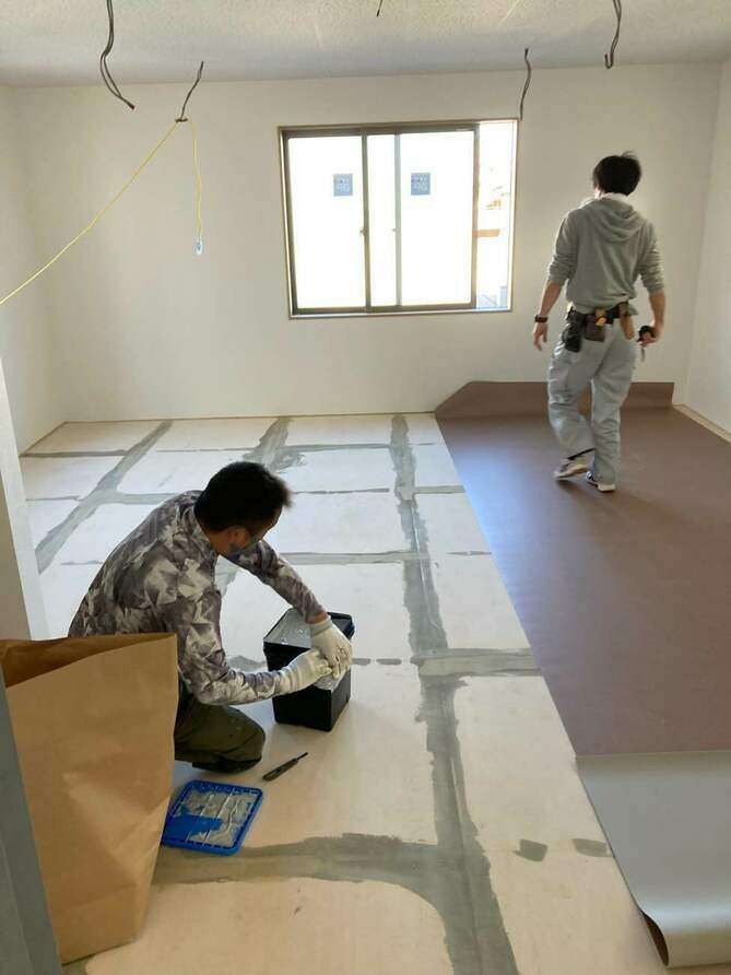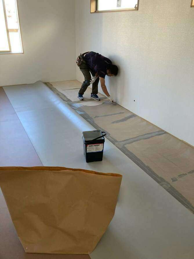 壁クロス張り替え中です。 次にタイルカーペット用のりをぬります。 タイルカーペットを...
