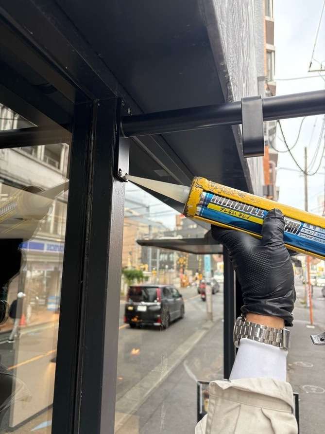 接着材入れ、ビス止め、防水処理します